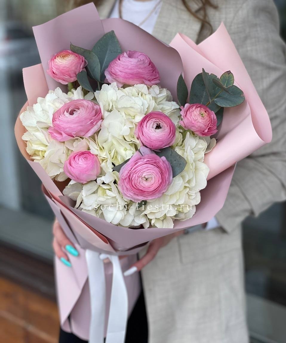 ранункулюсы, гортензия, эвкалипт, авторское оформление.