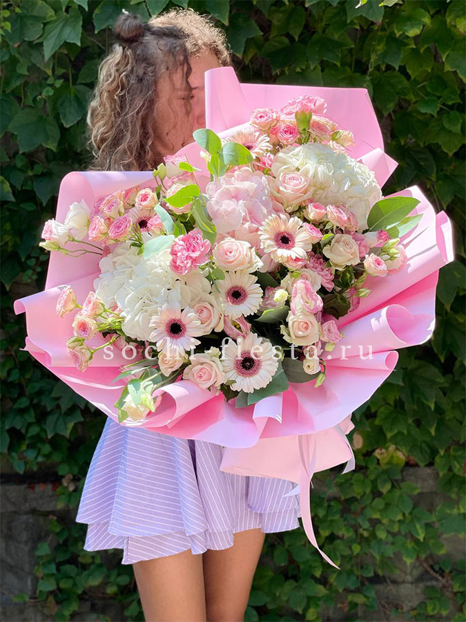 гортензия, герберы, эустомы, розы, диантус, эвкалипт, лента, дизайнерская упаковка.