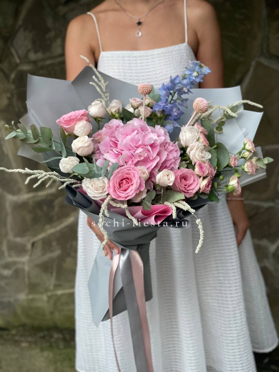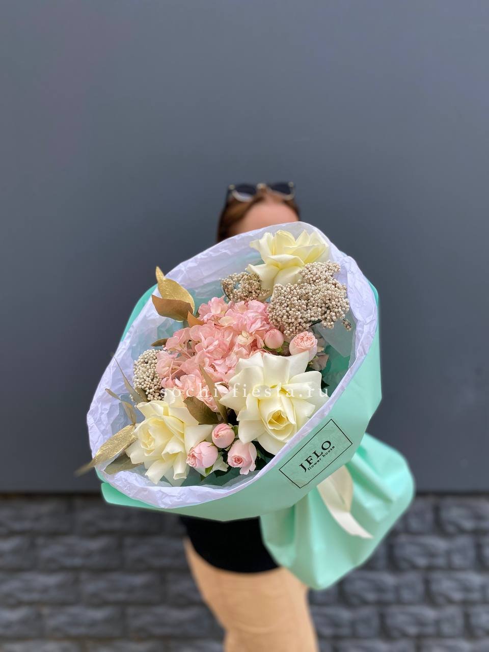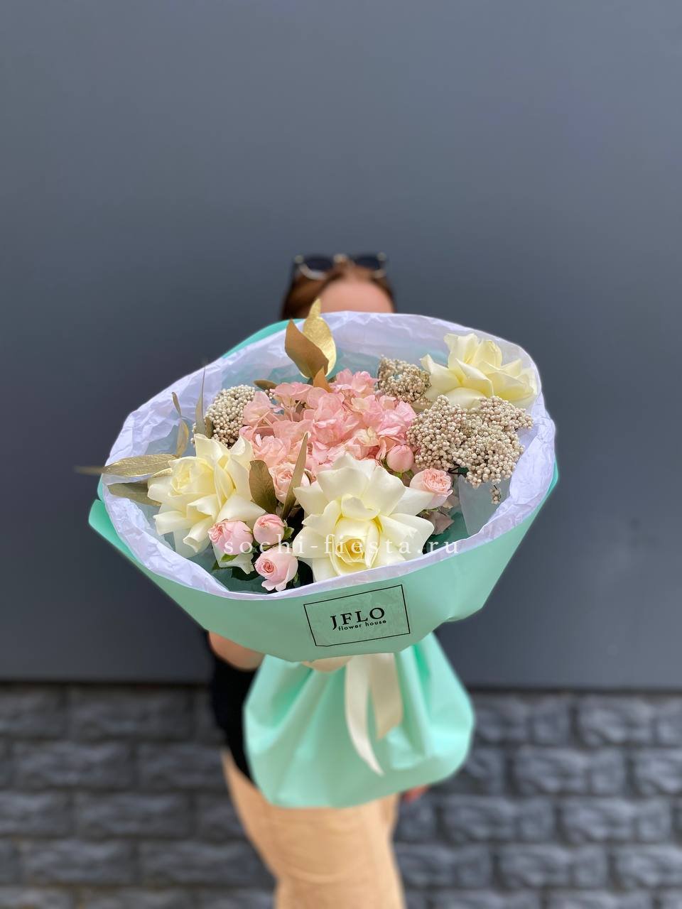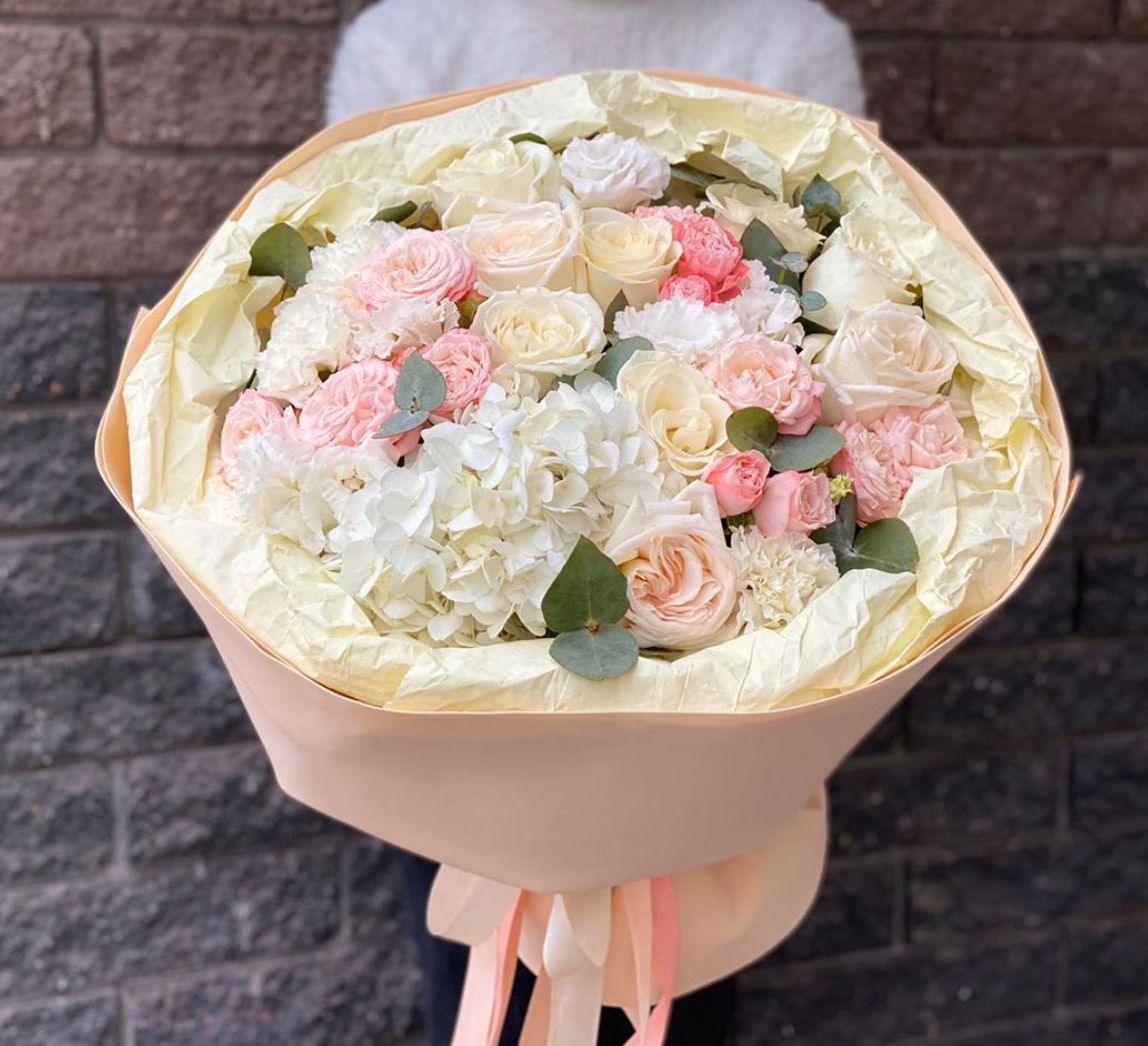 Пушистые шапки Мисти Бабблс переплетаются с классическими розовыми бутонами, создавая объёмный силуэт с мягкими переходами. Композиция собрана плотно, каждый цветок занимает своё место в общем ритме.