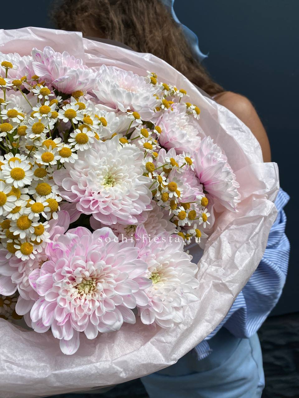 Белоснежные ромашки и кустовые хризантемы собраны в легкую композицию с открытой структурой. Прозрачная упаковка сохраняет воздушность и подчеркивает свежесть каждого бутона.