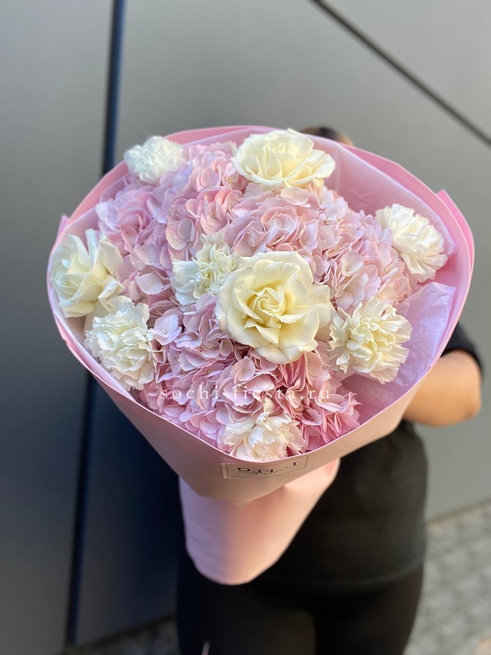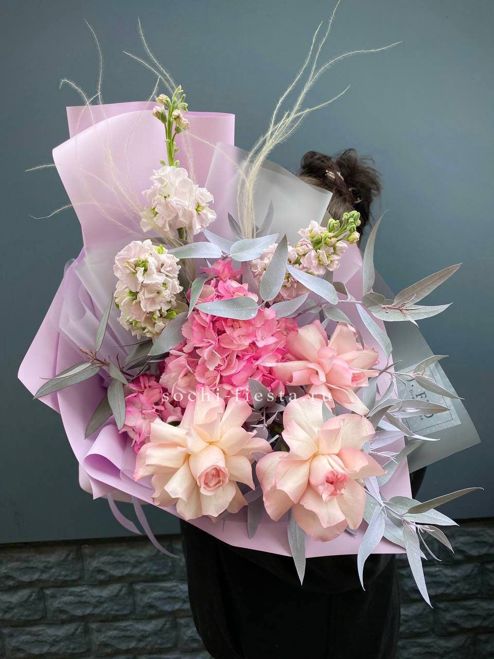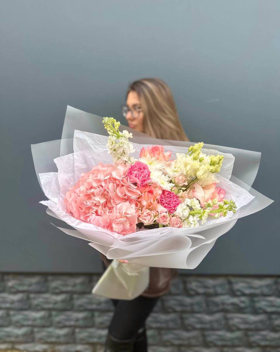 Крупные соцветия гортензии задают основной объем, а эустома и диантус разбивают плотность воздушными бутонами. Мисти баблс и озотамус рассыпаются между цветами, добавляя движение и легкость всей композиции.