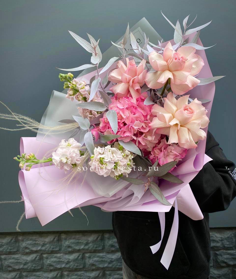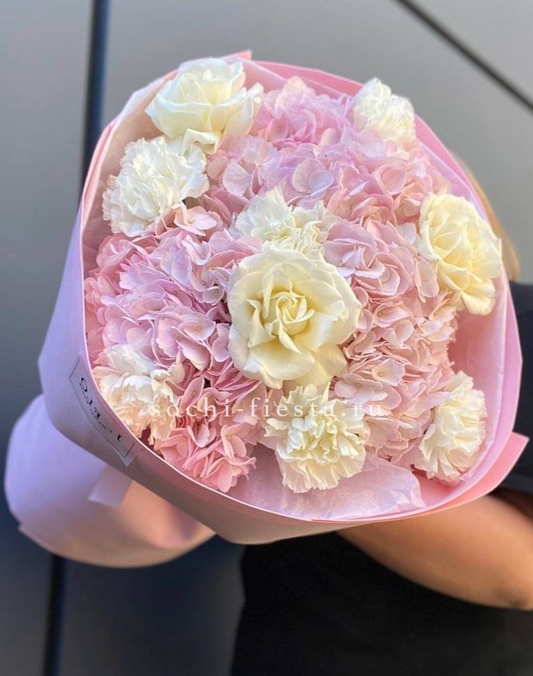 гортензия, эустома, диантус, мисти баблс, озотамус в нежном оформлении.