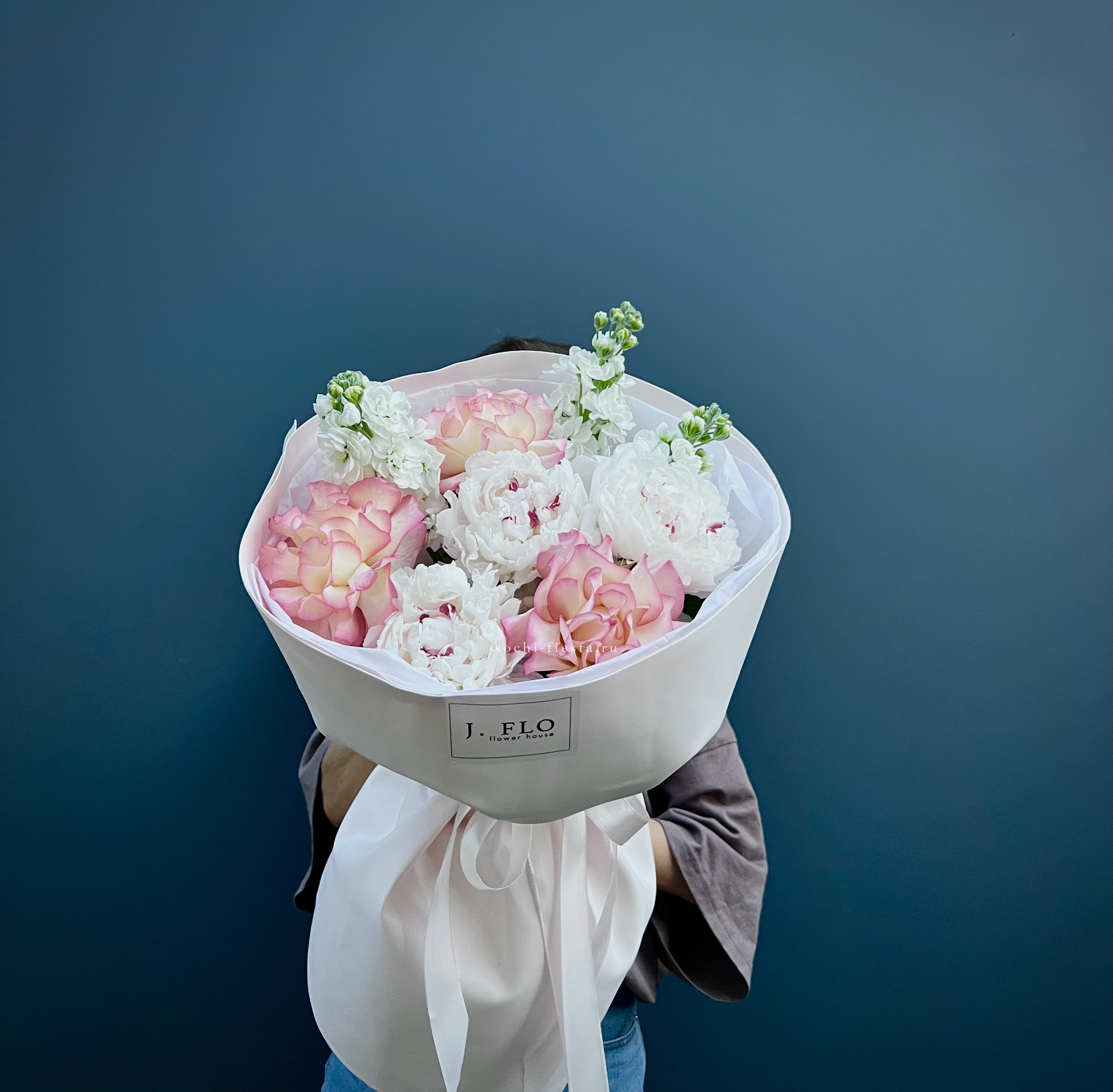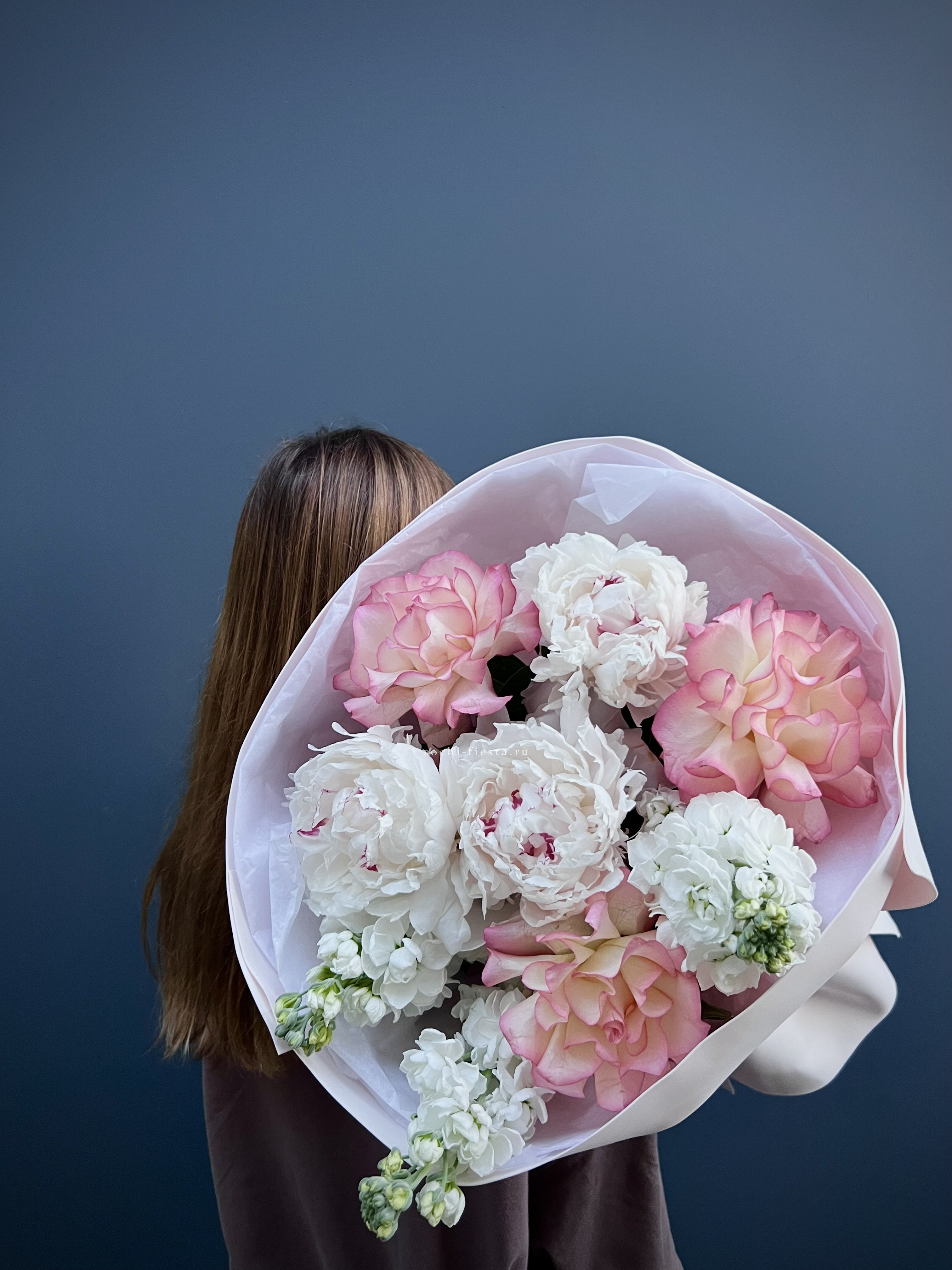 Пионы раскрываются пышными шапками, розы добавляют структуру, а маттиола наполняет букет вертикальными линиями. Тишью и пленка создают лаконичную обёртку, не перебивая природную красоту. Композиция выглядит свежо и объёмно.