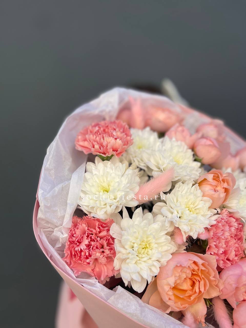 гортензия, диантус, хризантема, бомбастик, озатамус, пленка.