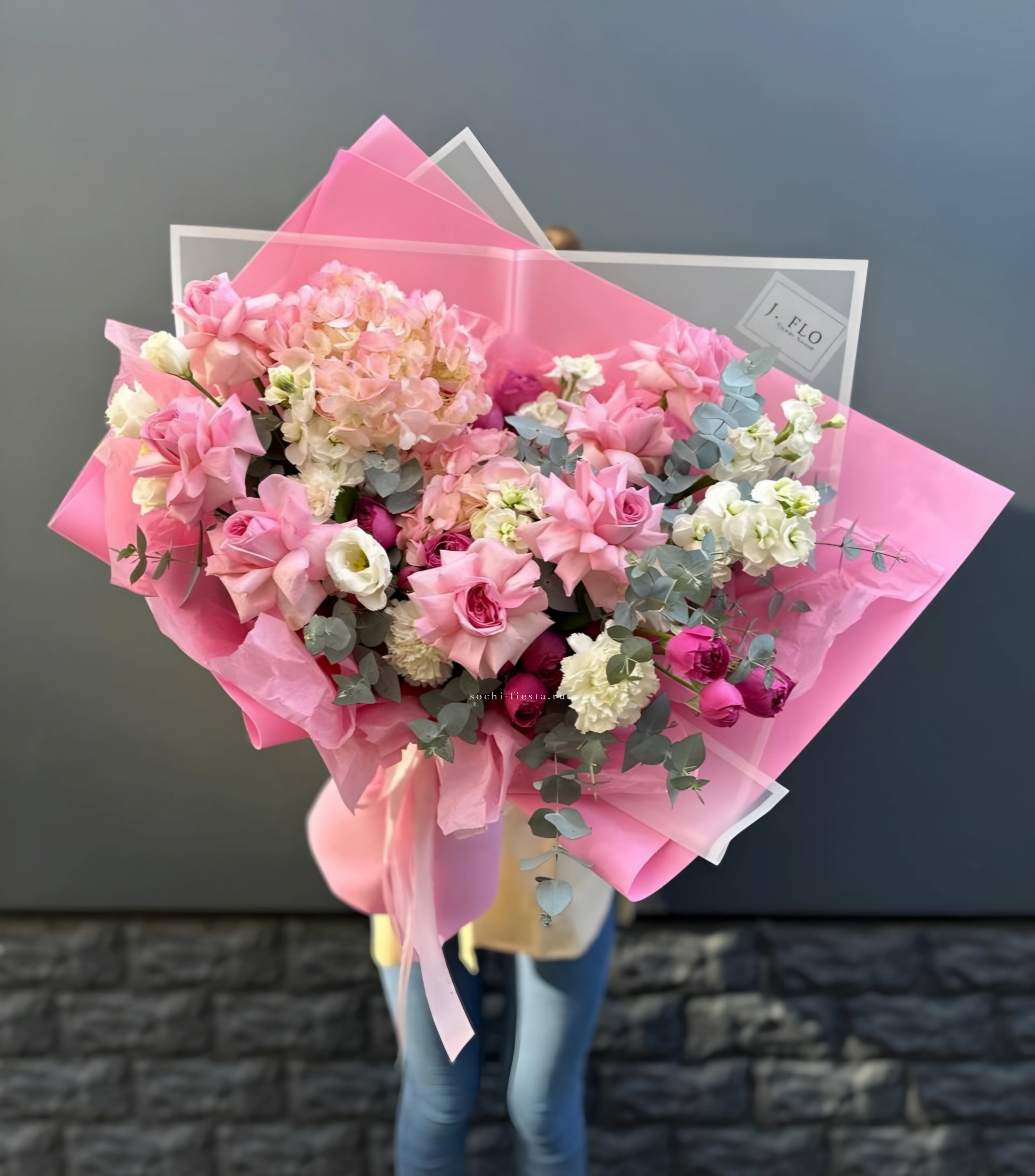 Lucrecia собрана из пионовидных и классических роз с добавлением пушистых кустовых хризантем. Букет легко впишется в современный интерьер и поддержит спокойную эстетику пространства.