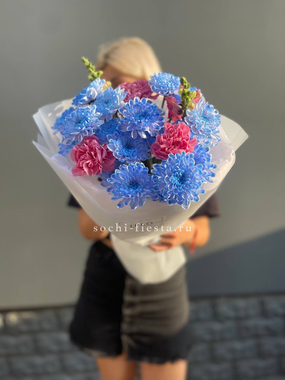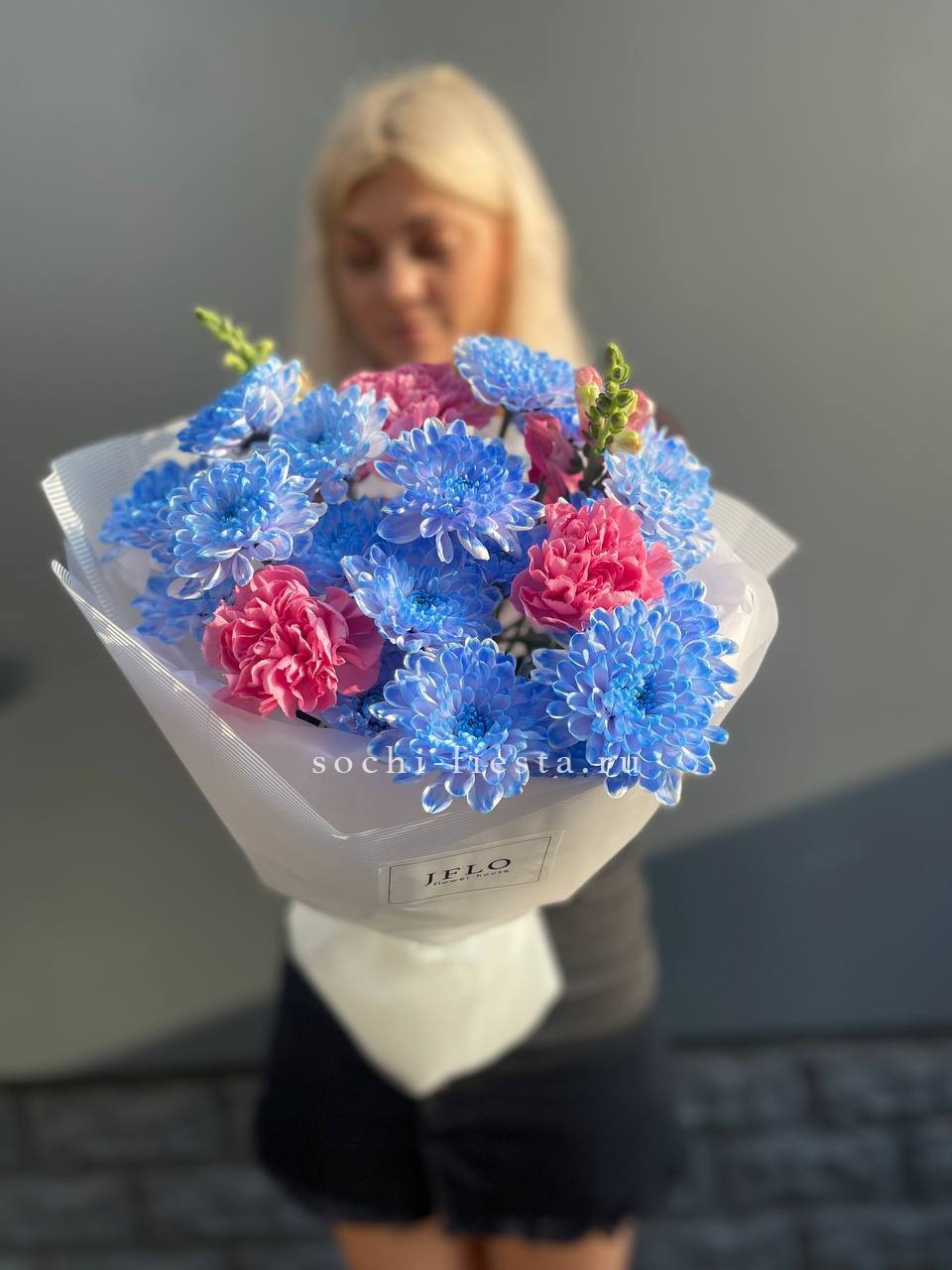 хризантемы кустовые, пионовидные розы, одноголовые розы, лента, дизайнерская упаковка.