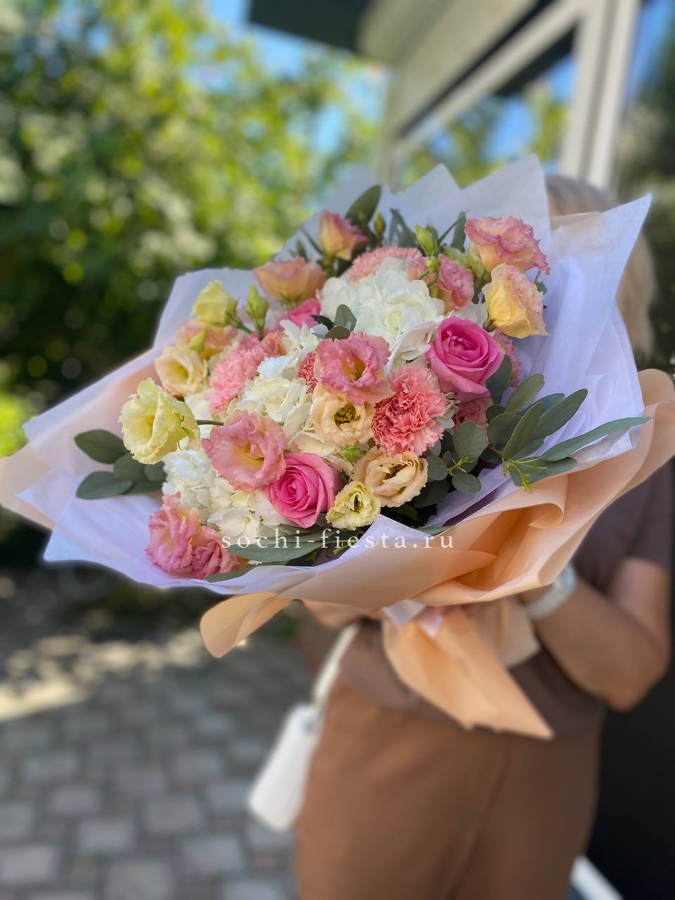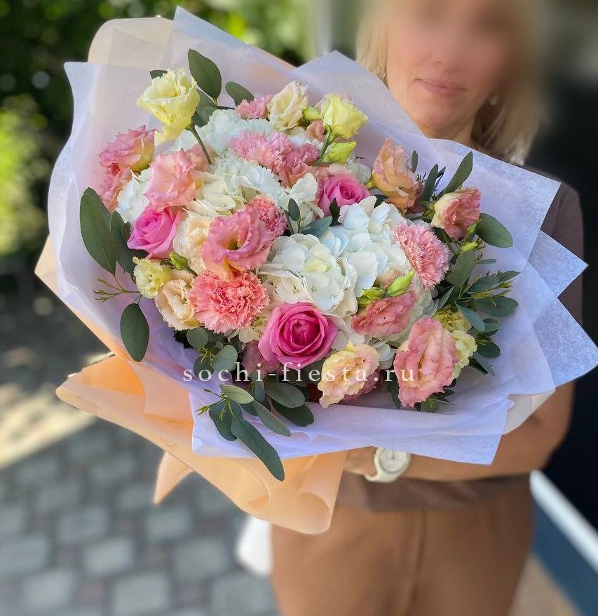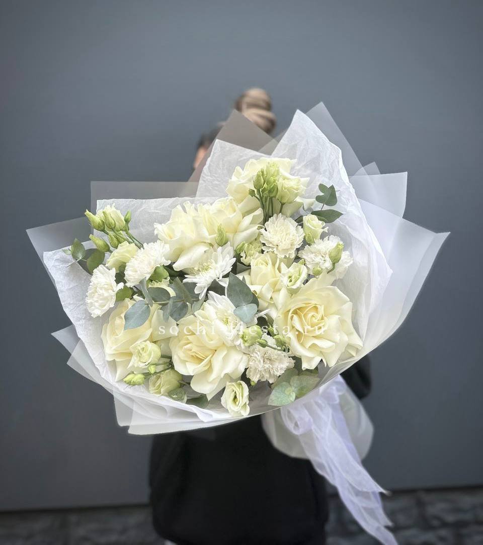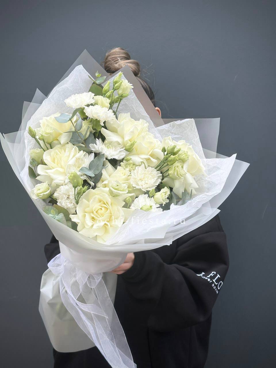 маттиола, диантусы, пионовидные розы Мисти Баблс, эвкалипт, лимониум, эустома лента, упаковка.