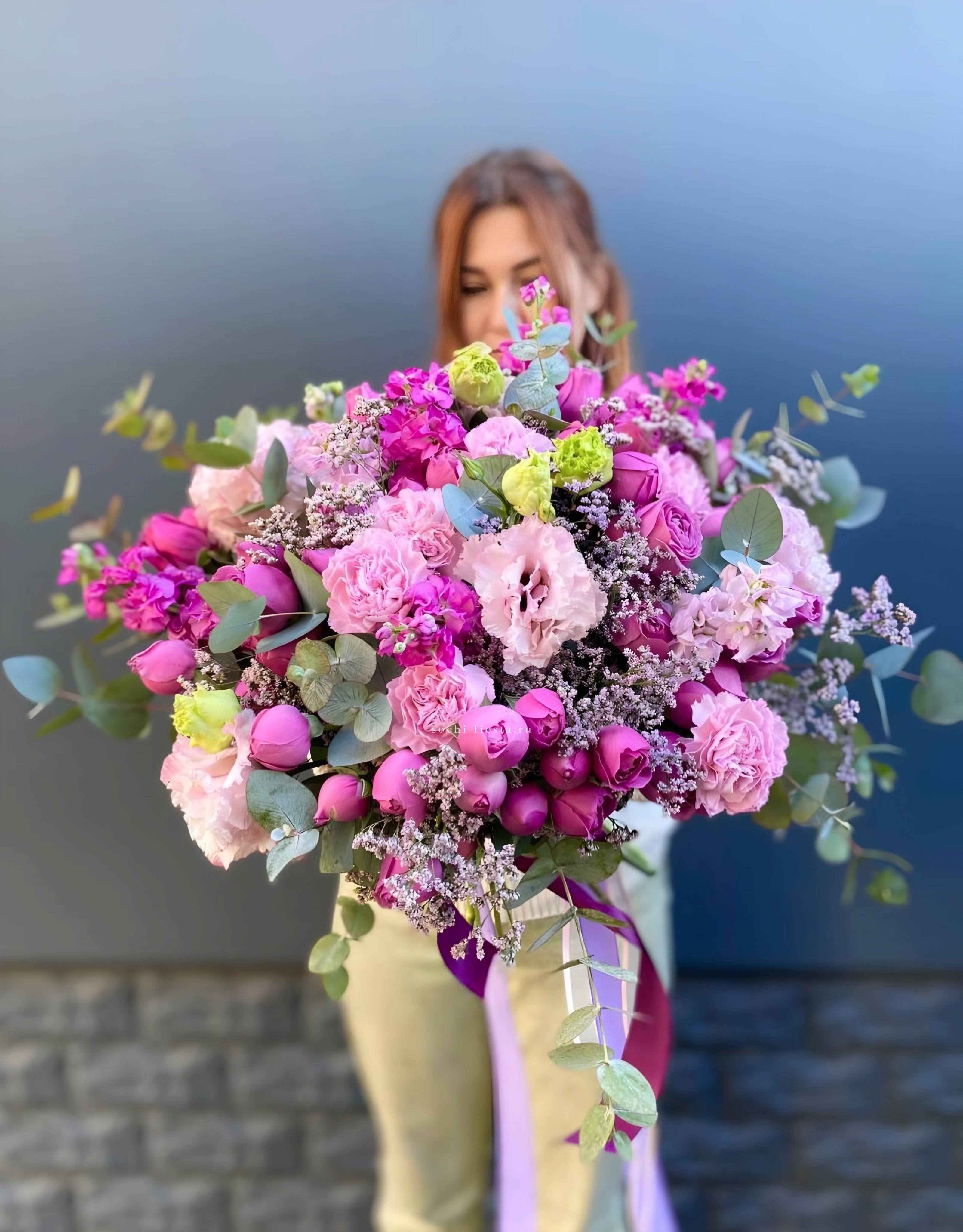 Маттиола и эустома создают воздушную текстуру, а пионовидные розы Мисти Баблс добавляют глубину каждому слою. Лимониум и эвкалипт заполняют пространство между бутонами, формируя сложный рисунок. Букет звучит современно и свободно.