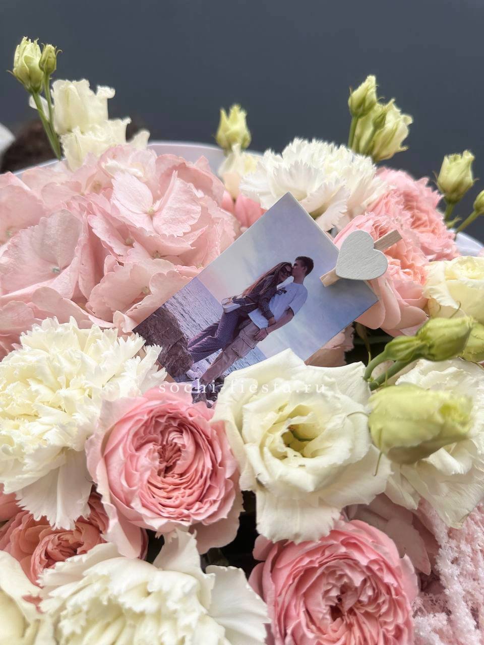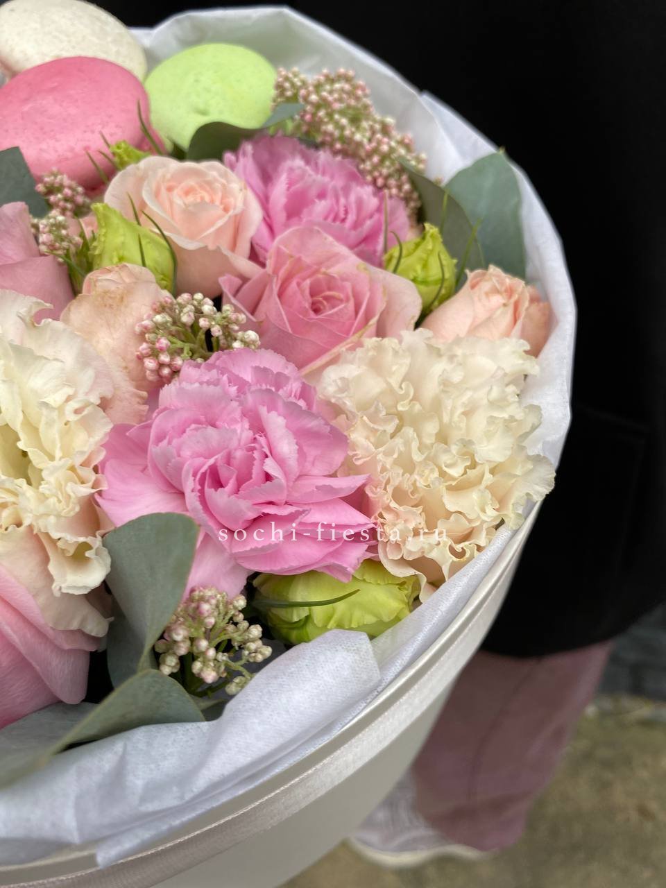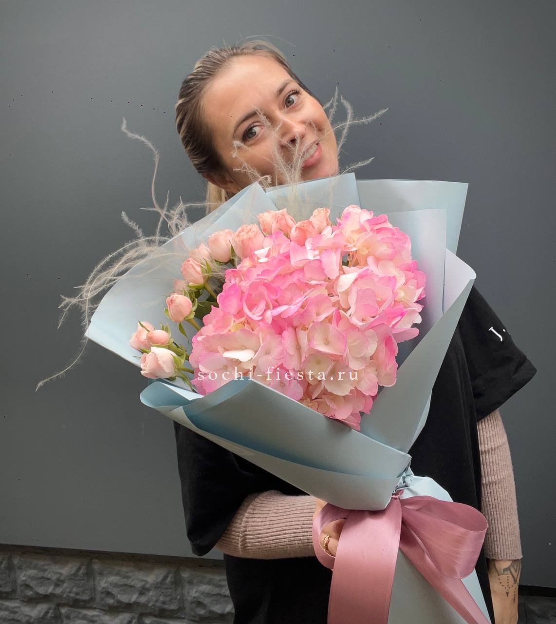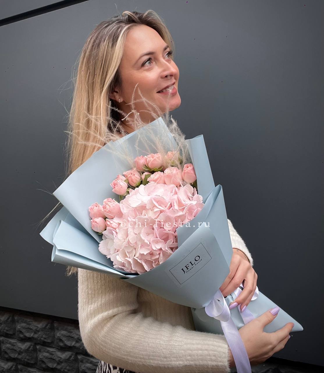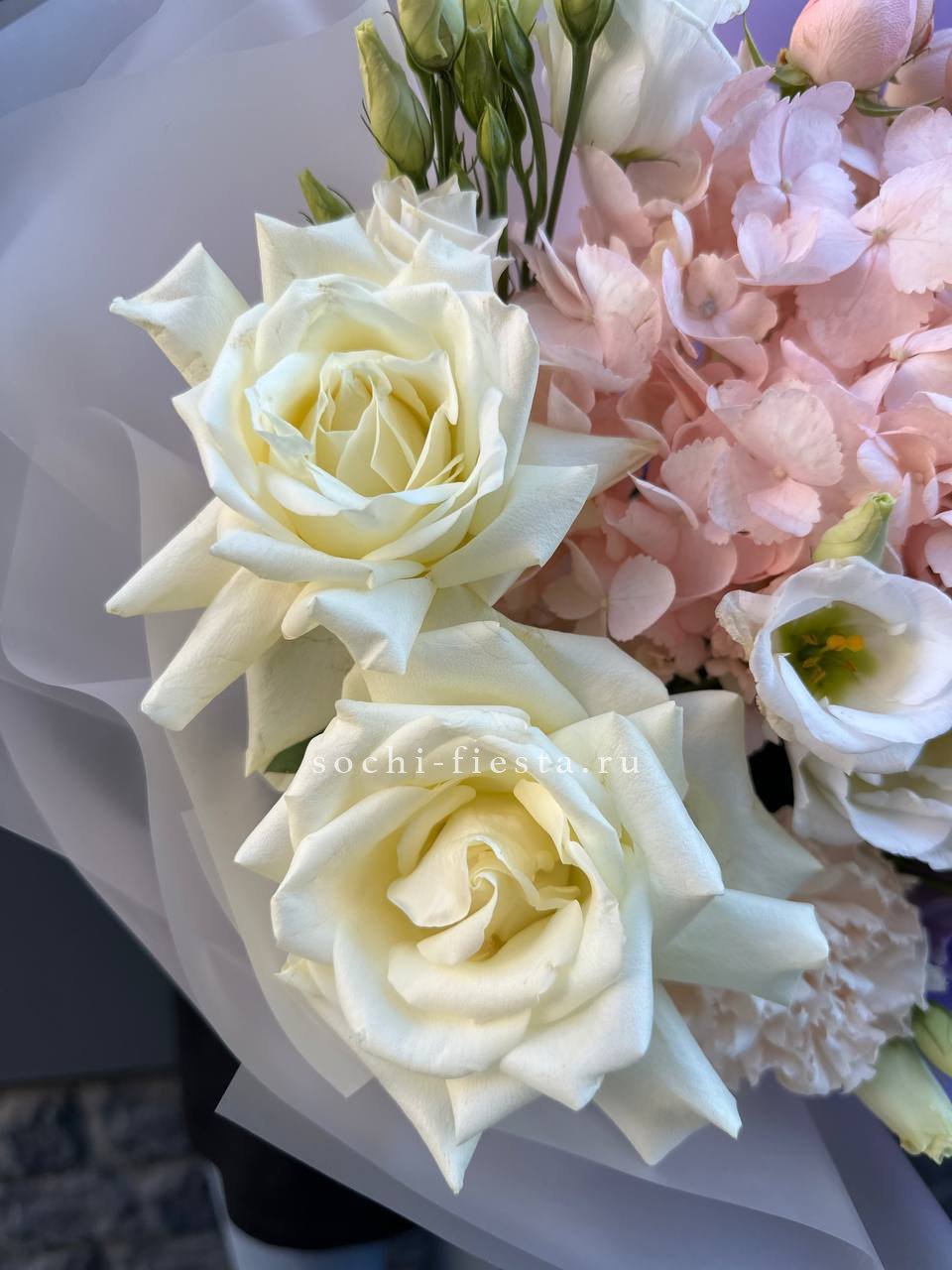 гортензия, гвоздика, статица (или аналог), роза, эустома, дизайнерская пленка, лента.