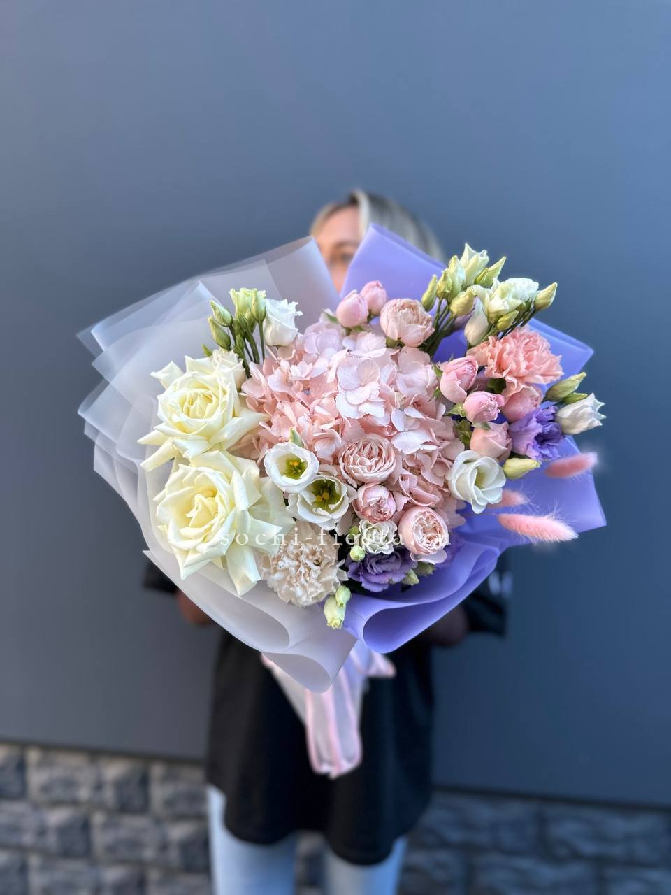 Фиолетовые оттенки переходят от насыщенной гортензии к лиловым бутонам роз и статицы. Гвоздика и эустома разбавляют глубину палитры светлыми акцентами.
