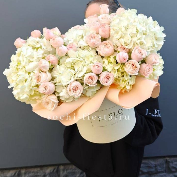 • Шляпная коробка с розами и гипсофилой — универсальный формат.